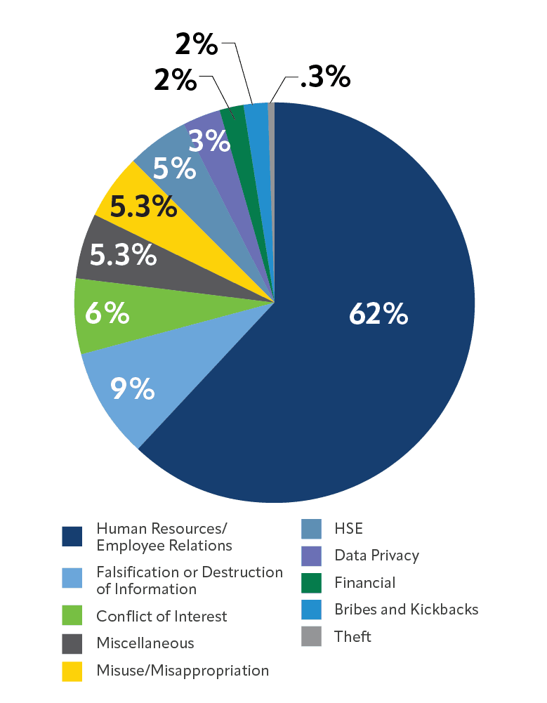 Reported concerns included human resource-related concerns such as harassment and retaliation (62%); falsification or destruction of information (9%); conflicts of interest (6%) and health, safety and environmental (5%).